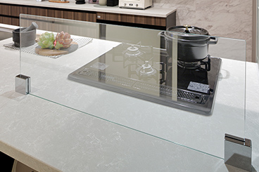 料理中の油や水ハネなどを軽減します。ガラス製ですっきりした開放的な空間になります。