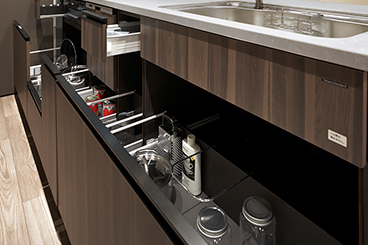裏面に制振材を貼ることで水はね音や食器類の落下音を低減。お皿洗いや調理中でも家族との会話が楽しめます。また、大きな鍋も洗いやすいワイドサイズのシンクです。