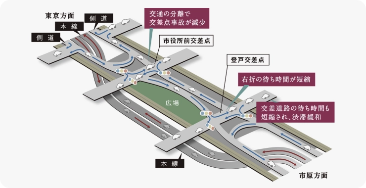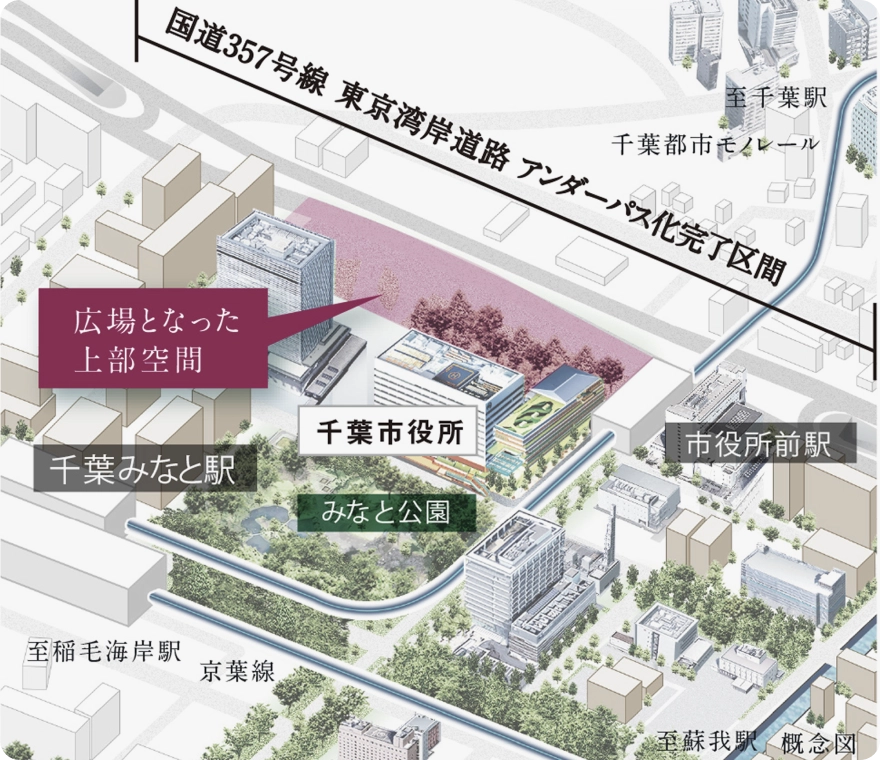 千葉市役所付近の渋滞緩和のため実施してきたアンダーパス化の工事は2015年に完成。また、市役所に隣接する地表部分にはイベント広場を整備するなど上部空間の沿道環境の改善にも寄与しています。