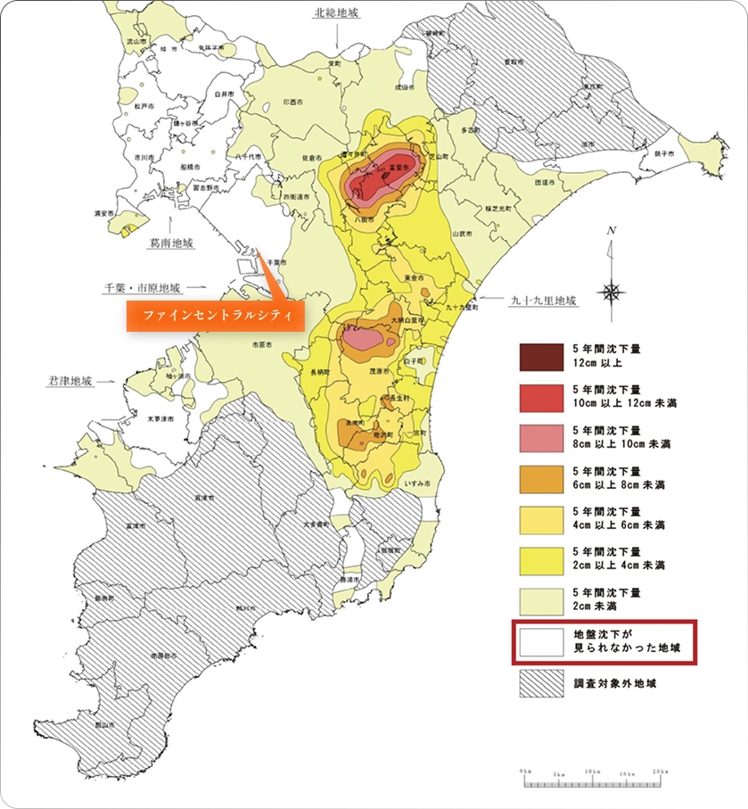 下記は千葉県が発表した、令和元年から令和6年までの地盤沈下状況を示した図です。ファインセントラルシティ周辺は地盤沈下が見られなかった地域です。