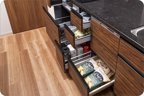 カウンター下部は奥まで整頓できる収納空間に。キッチン用品や調味料などを豊富に収納できます。