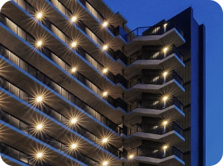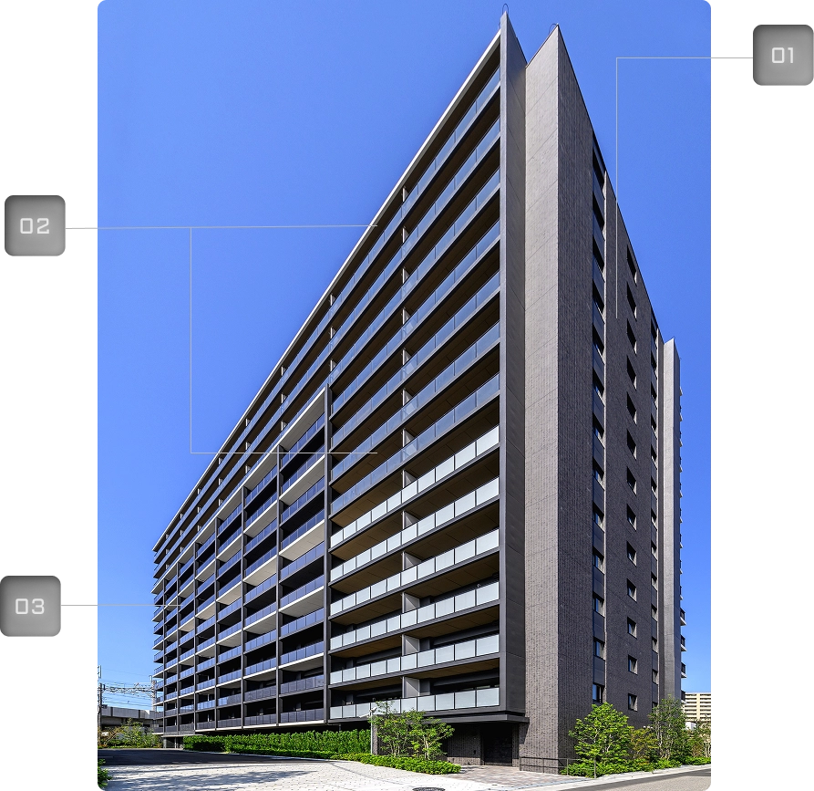 躍動的な暮らしをかなえる地にそびえるレジデンスだからこそ、躍動感のあるデザインを追求。 また、外観タイルやガラス貼りのバルコニー手摺など、 細部までこだわることで、本格派の邸宅としての美学や風格を息づかせました。