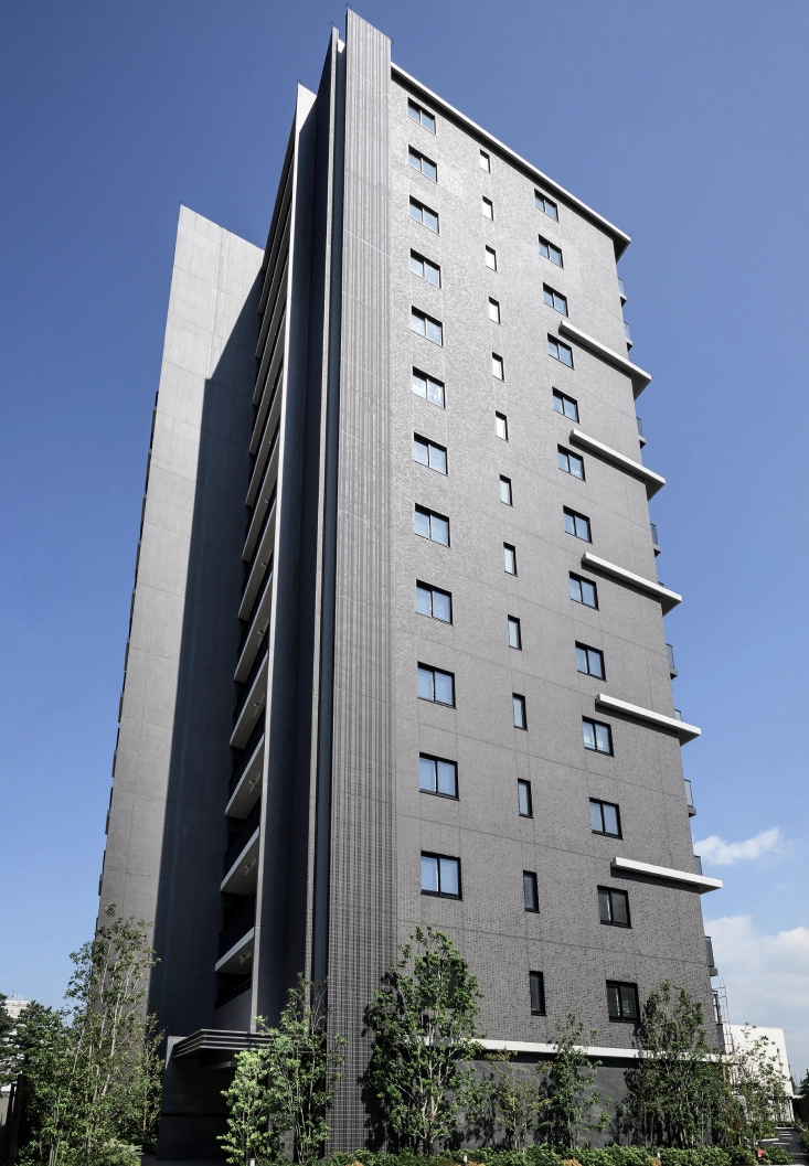 ダークカラーの風格あるタイルを基調に、ブラック系のカラーを組み合わせることで、 空へと伸び上がるようなスタイリッシュさと、スケール感を感じさせる風格を享受するレジデンスへと仕立てました。 マテリアル1つ1つにこだわり、都市的な雰囲気だけでなく、緑の潤いとも調和するようなデザインとしました。
