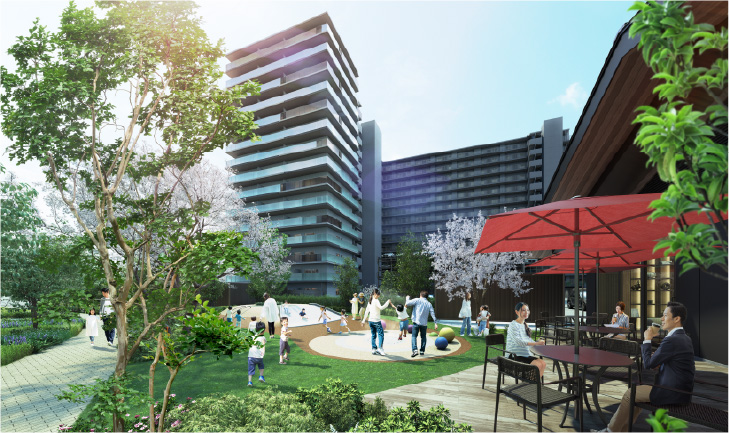 ※2 本マンション(敷地面積24,156.09㎡(売買対象面積))は、1995年以降、Osaka Metro 御堂筋線各駅より徒歩5分圏内にて供給された新築マンションにおいて、敷地面積が「最大」となります。(2025年1月MRC調べ)