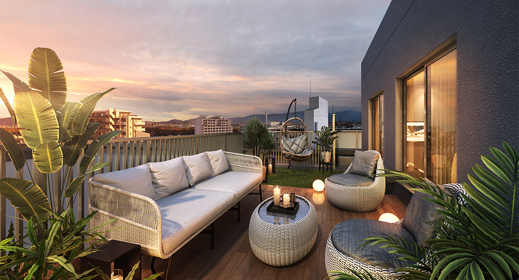 ※ 掲載のルーフバルコニー完成予想図は計画段階の図面を基に描き起こしたもので、実際とは異なる場合がございます。今後行政の指導、施工上の理由等により外観・外構・植栽・仕様・色彩等に変更が生じる場合がございます。敷地外の一部、建物形状の細部、設備機器等の表現につきましては一部省略しております。予めご了承ください。
