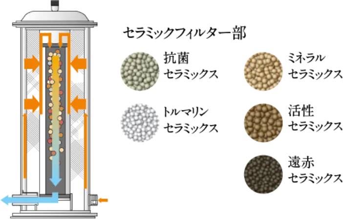 使用時の微粉発生がなく、各種フィルターが水中に含まれるカビ等の異臭味物質や有機物を除去し、優れた処理能力を誇ります。また塩素の刺激も抑えられるため、肌や髪への刺激も少なくなります。長時間水を使わない時も、水道管の中の滞留水で繁殖する菌を抑制するために、塩素濃度を最小限レベルで一定に保つ構造となっているので安心です。[実用新案登録 第3137167号]