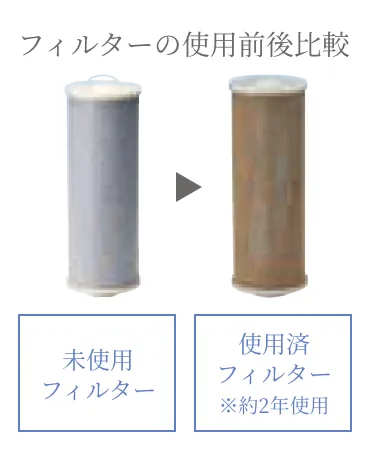遊離残留塩素ろ過性能としては、500トンの処理が可能です(90%ろ過値)。2リットルのペットボトルに換算すると25万本分の処理が可能です。ミネラルウォーターを購入する手間がなく、ペットボトルゴミを減らすことに貢献します。