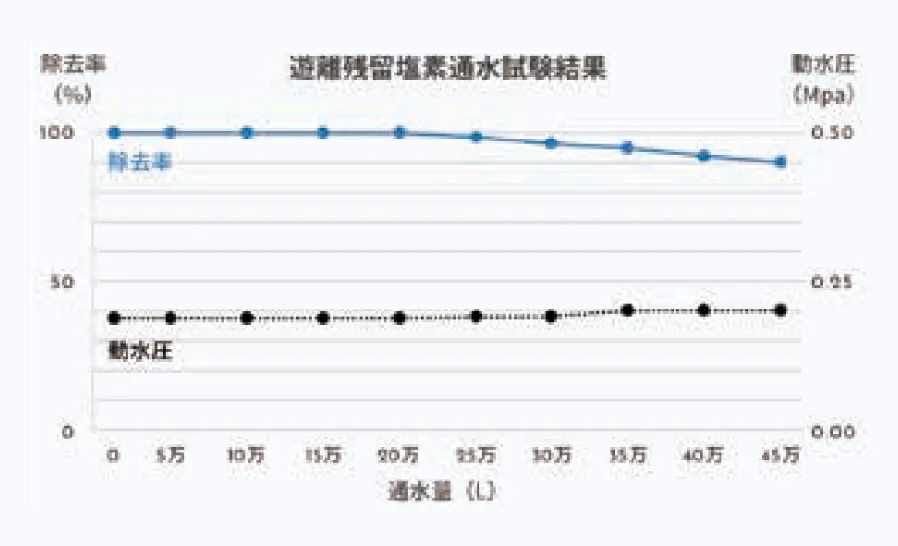 ※試験条件:原水遊離残留塩素濃度2.0±0.2mg/L / 流量:15.0L/分(SV320/hr)/ 水温:19~22℃備前市鶴見水道水使用/終夜連続通水実施 クラレケミカル(株)鶴見研究開発センター