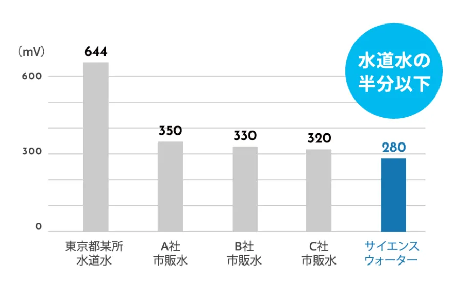 水の酸化力と還元力を電位差で表したものが「酸化還元電位」。この数値は、水に含まれる薬品や金属、ゴミ等の不純物が多くなると高くなります。市販の天然水は、その数値が水道水に比べると低く、身体の細胞への浸透率が高い「おいしい水」として知られています。検査の結果「サイエンスウォーター」は、これらより数値がすぐれていることが実証されました。