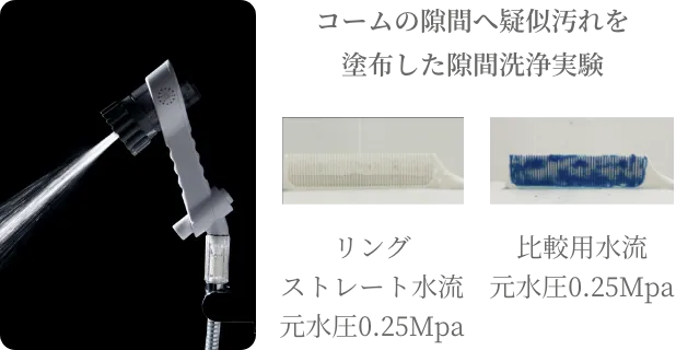※コーム隙間(約1mm間隔)に着色したでんぷん糊を塗布。ミラブルzeroリングストレート水流(水量:毎分6リットル)とノーマル水流(水量:毎分11.4リットル)をそれぞれ吐出しコームを洗浄。室温:23℃、湿度:52%、水温:37℃ 試験日:2022/04/25