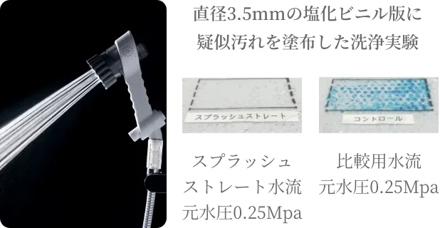 ※直径3.5mmの穴を3.5mm間隔で開けた塩化ビニル板に着色したでんぷん糊を塗布。ミラブルzeroスプラッシュストレート水流(水量:毎分7リットル)とノーマル吐水シャワー(水量:毎分11.4リットル)をそれぞれから吐出し塩化ビニル板を洗浄。室温:23度 湿度:71% 測定日:2022/04/26