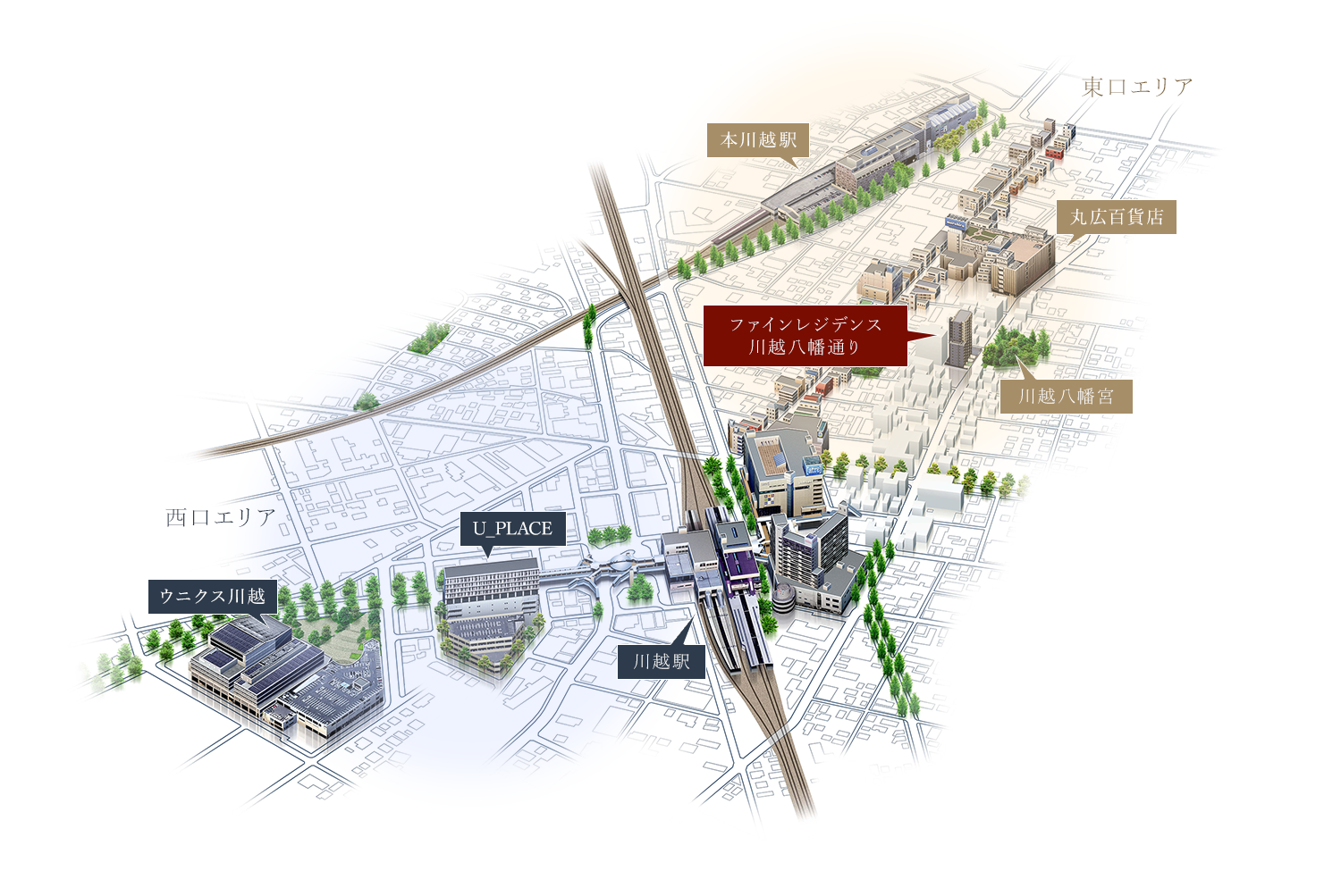 「川越」駅周辺には、「アトレ川越」「ルミネ川越」「EQUiA川越」などの商業施設がペデストリアンデッキで結ばれた高度な利便環境を形成。