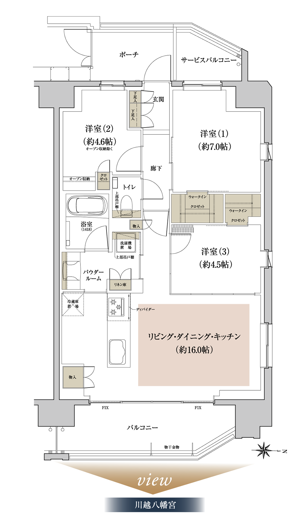 ポーチ面積:5.13㎡(約1.55坪)/サービスバルコニー面積:3.58㎡(約1.08坪)
