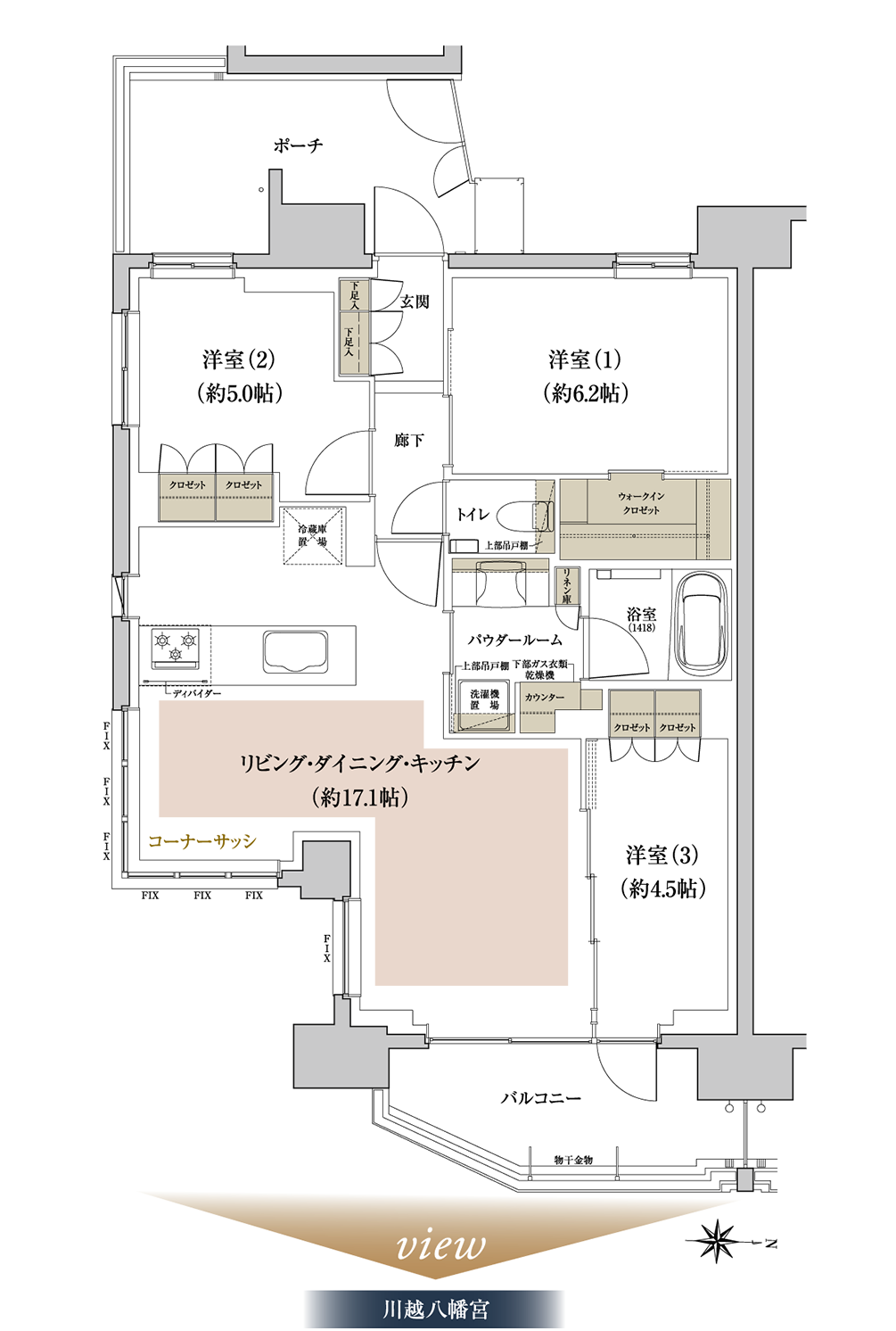 豊かな眺望を楽しめるコーナーサッシを採用した3面開口の南東角住戸。