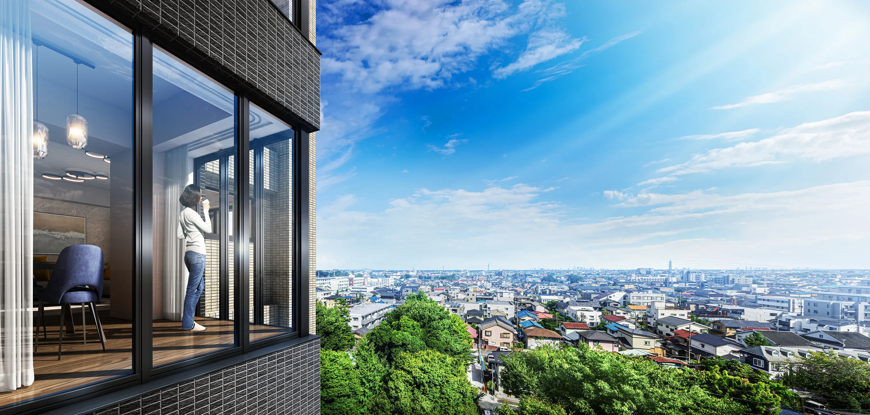 ※掲載の外観完成予想CGは2025年9月に撮影した眺望写真に計画段階の図面を基に描き起こした外観完成予想CGを合成・加工したもので、形状・色等は実際とは異なります。外観形状の細部、給湯器、雨樋、給気口、スリーブ等の設備機器は省略・又は簡略化しています。また、眺望・周辺環境は将来にわたって保証されるものではありません。