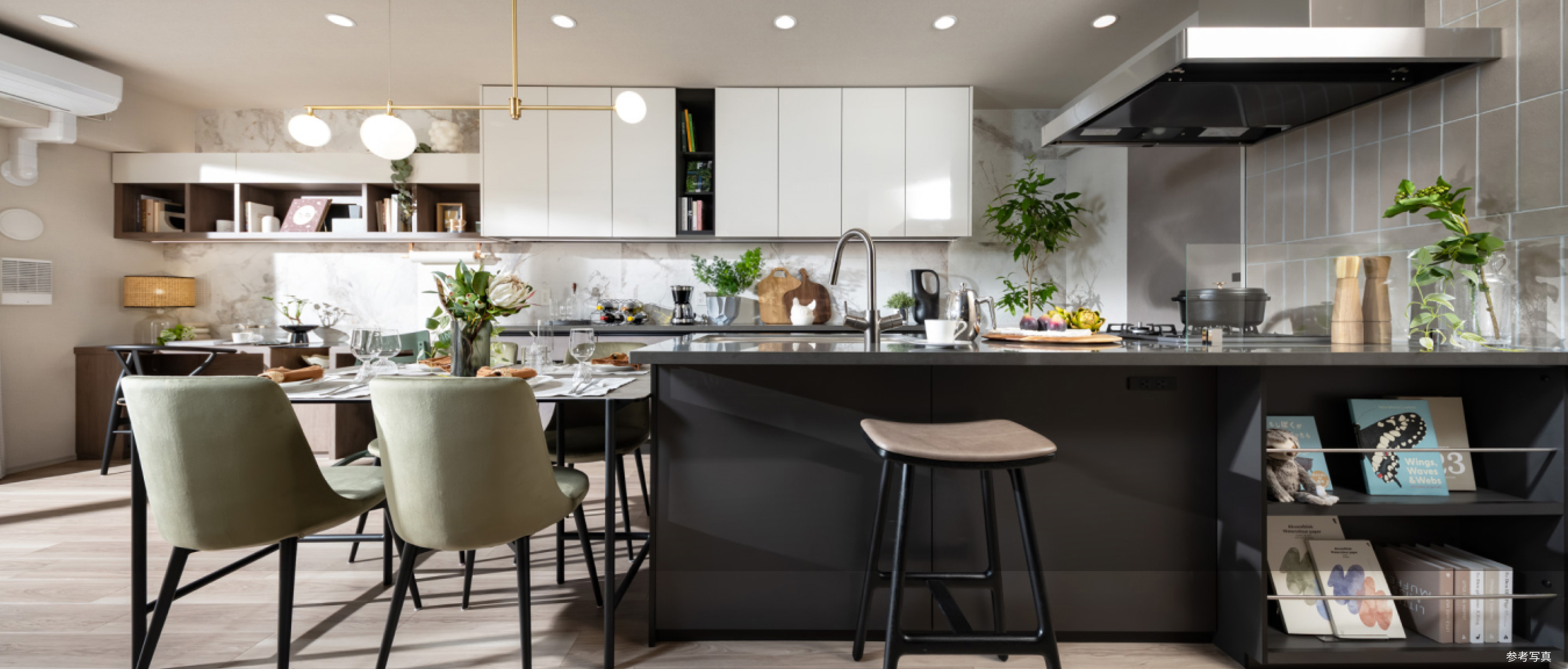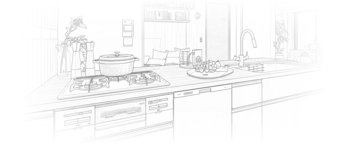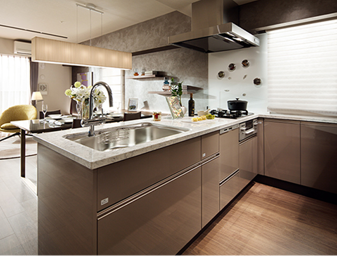 ガスコンロ前の壁をなくしたフルオープンタイプキッチンは、リビングとの一体感を高め、家族との会話もはずみます。※写真は一部オプションを含みます。