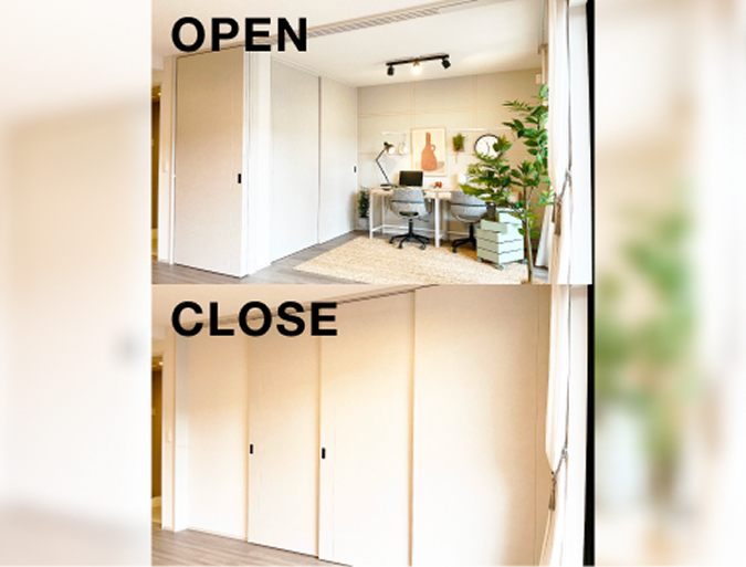 リビングと洋室の間にスライドドアを採用。開け放つとリビングと洋室を一体の開放的な空間として、閉めると独立した個室空間として使用できます。