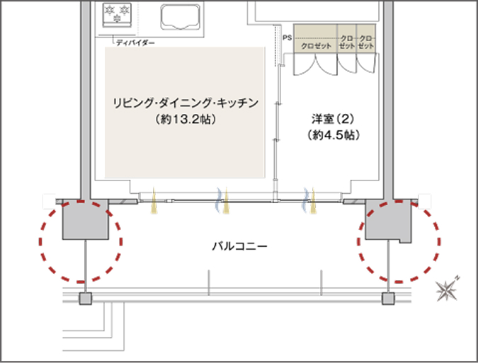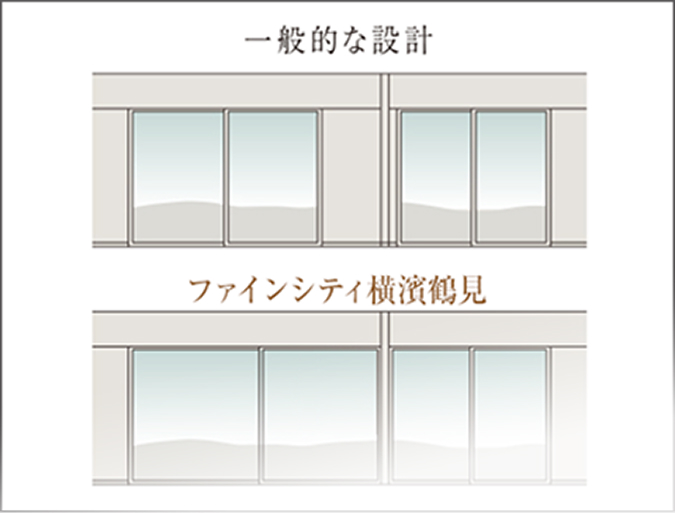 柱を外に出したアウトフレーム工法を採用。デッドスペースが生じないため、家具レイアウトの自由度も高まります。※一部除く