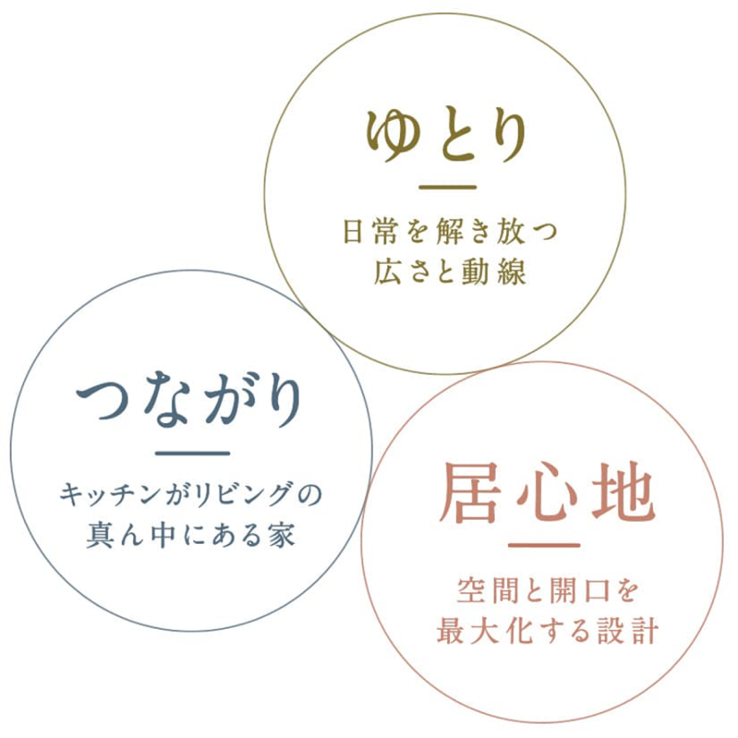 広さという本質的なゆとり。快適な家事動線が生み出す時間のゆとり。多彩な収納が生み出す空間のゆとり。その一つ一つが心のゆとりを育み、家族時間がもっと充実していきます。