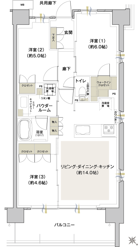 ※バルコニー手摺及び柱の形状は階数により異なります。※施工の都合により設計仕様・設備機器の取り付け位置・寸法等に多少の変更が生じる場合があります。