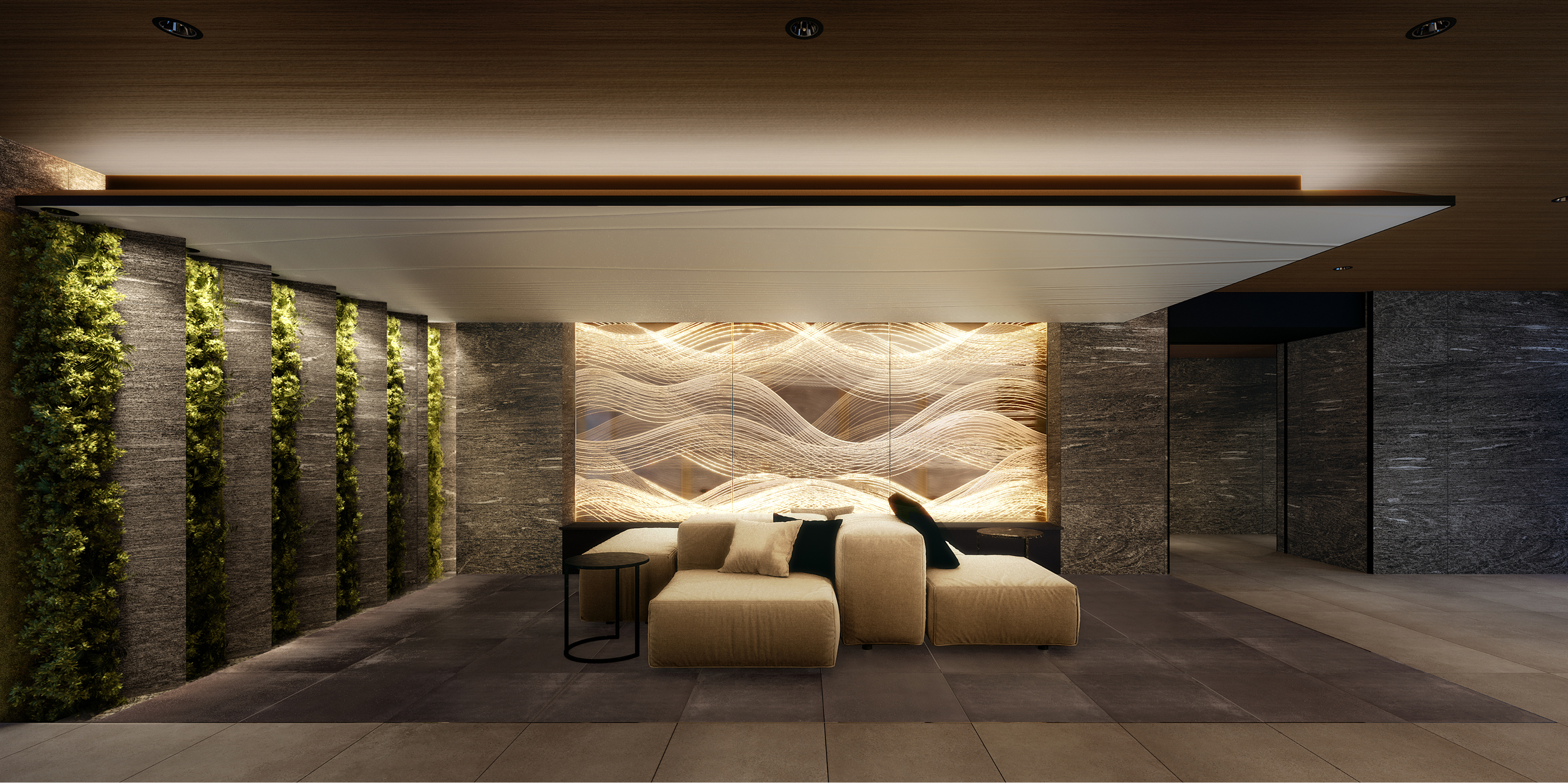 折り上げ天井の間接照明や壁面緑化、