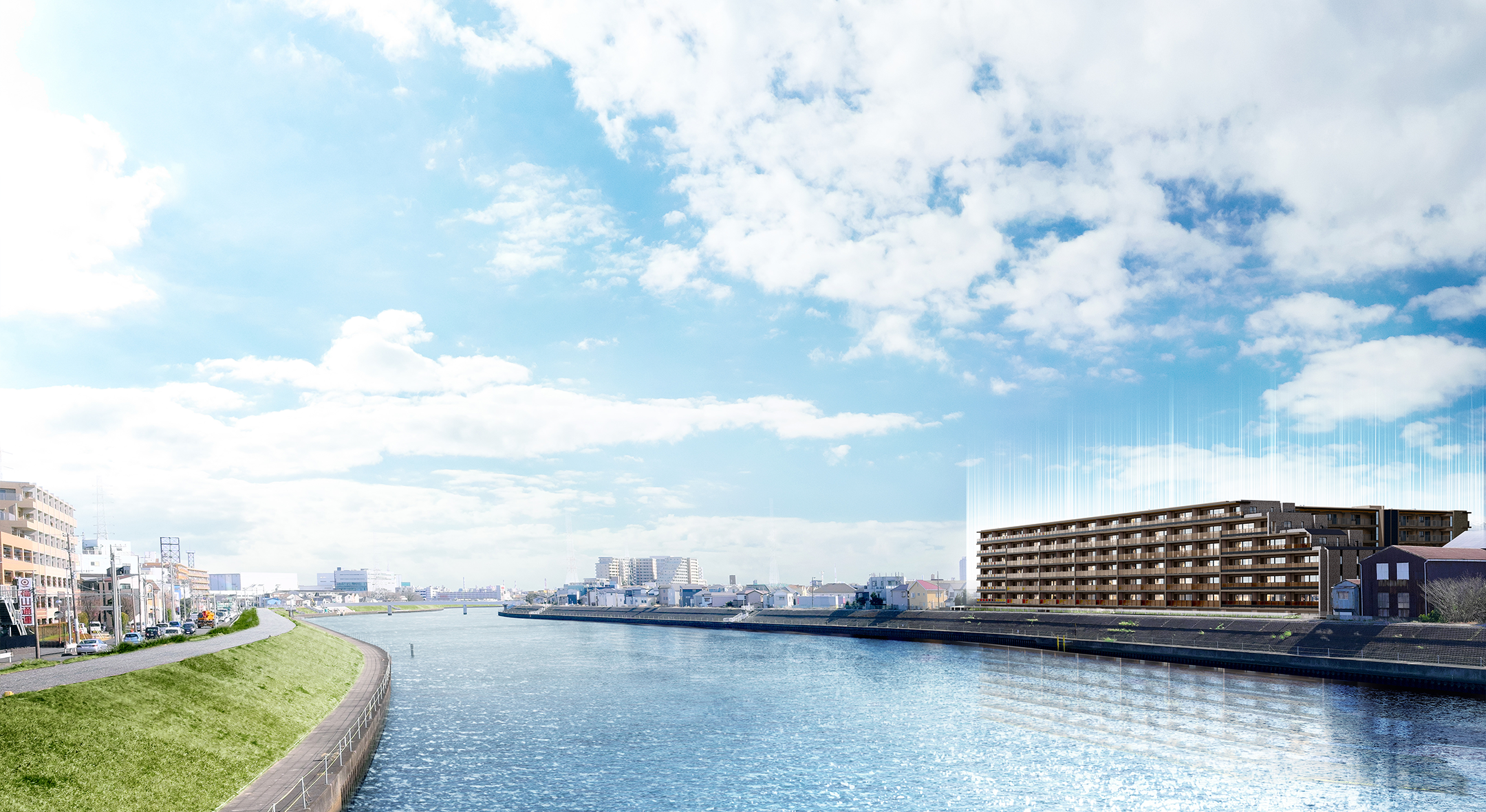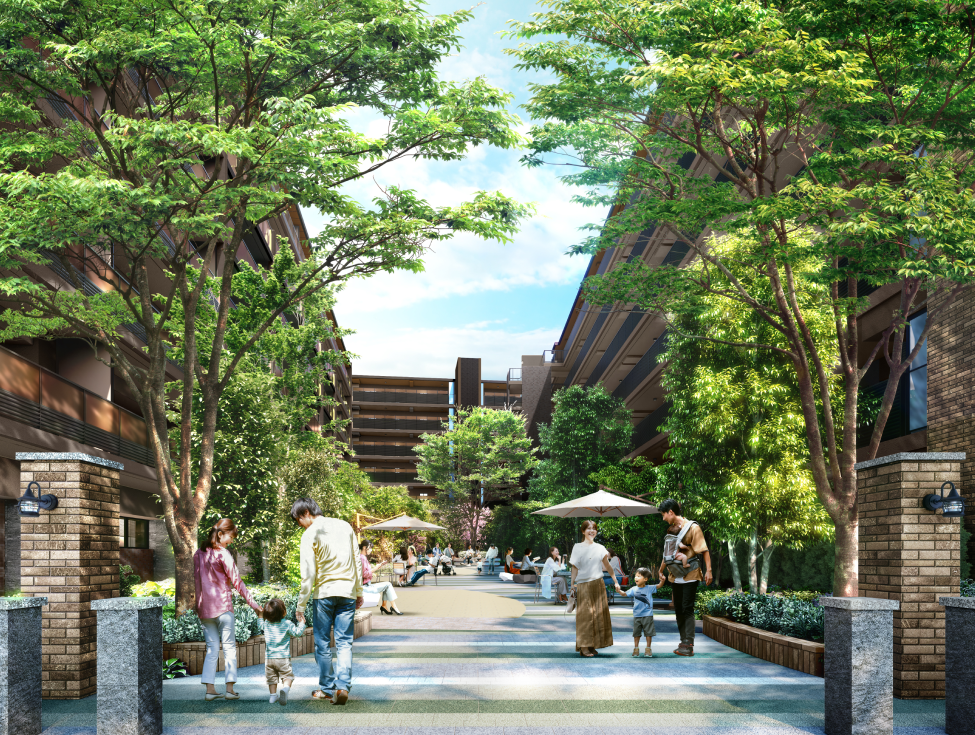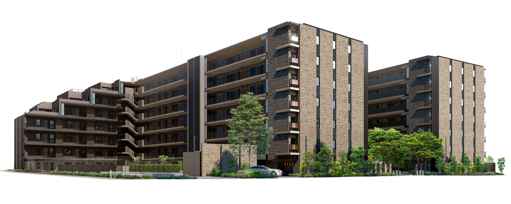 ※掲載の各完成予想図・イラストは計画段階の図面を基に描いたもので実際とは異なります。また今後変更になる場合があります。なお外観の細部・設備機器・配管類・サッシ等、および計画地周辺の建物・道路・電柱・標識・架線・ガードレール等は一部省略又は簡略化しております。掲載のタイル・各種部材につきましては実物と質感・色等の見え方が異なる場合があります。植栽につきましては、特定の季節の状況を表現したものではなく、竣工時には完成予想図程度には成長しておりません。