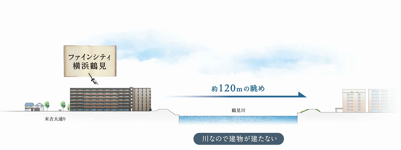 川が建物との距離を約120mも引き離し、