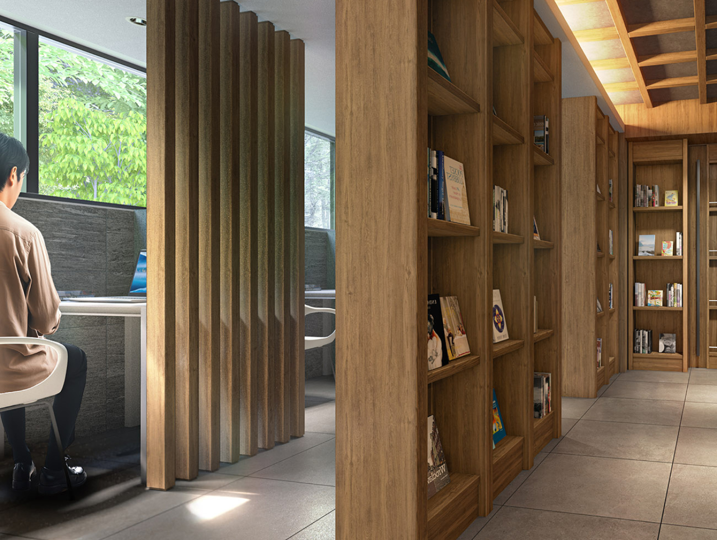 木のぬくもりと美しい書棚に囲まれた、