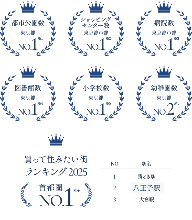 八王子市は多彩な魅力が豊富で、東京都全域の中でも「都市公園数」「ショッピングセンター数」「病院数」「図書館数」「小学校数」でNo.1、「幼稚園数」でNo.2と高い数字を誇ります。