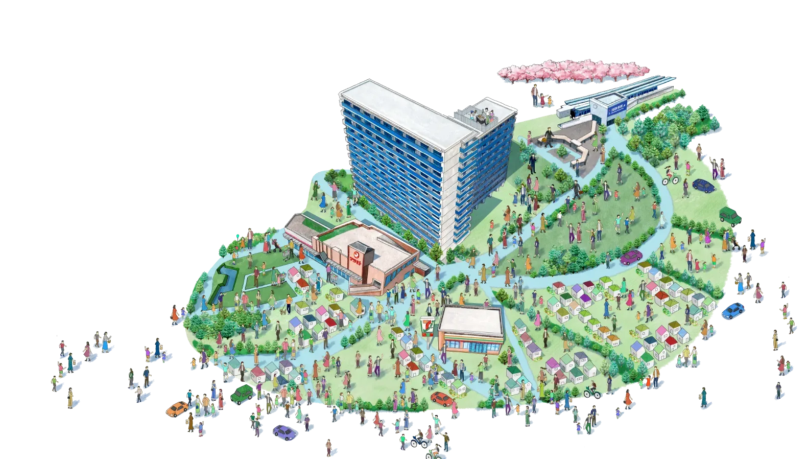 - ※掲載の街並みイメージイラストは現地周辺の航空写真等をもとに描き起こしたもので実際とは道路の形状、建物の位置関係、サイズ、距離等は異なります。周辺の建物や電柱・架線・道路標識などは表現上省略しております。また、外観完成予想イラストは計画段階の図面を参考に描き起こしたもので形状等は実際とは異なります。