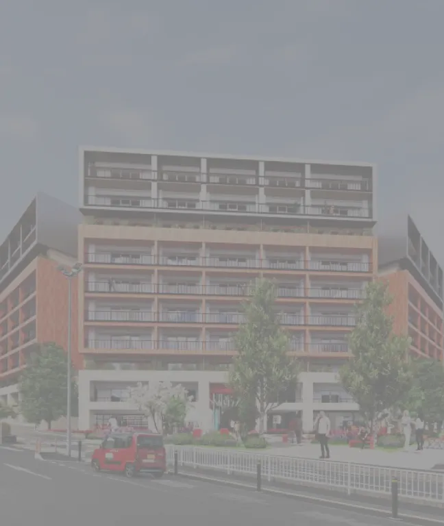- ※掲載の外観完成予想図は計画段階の図面を基に描き起こしたもので、実際とは異なる場合がございます。今後行政の指導、施工上の理由等により外観・外構・植栽・仕様・色彩等に変更が生じる場合がございます。敷地外の一部、建物形状の細部、設備機器等の表現につきましては一部省略しております。予めご了承ください。