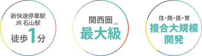 - ※1 1997年以降関西圏(大阪府、京都府、兵庫県、滋賀県、奈良県、和歌山県)で供給された新築分譲マンションのうち、最寄り駅より徒歩1分圏内の新築分譲マンションにおいて、敷地面積では本マンションが最大となります。(2025年11月時点MRC調べ)